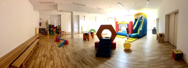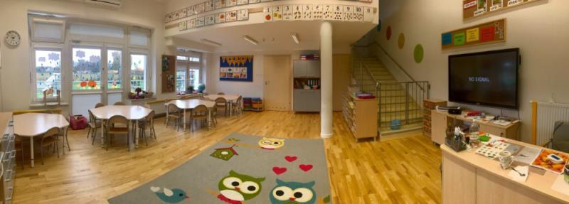 Budynek posiada 6 sal dydaktycznych z sypialniami na antresolach oraz tarasami zewnętrznymi, salę gimnastyczną z mini amfiteatrem zewnętrznym, szatnie oraz nowocześnie wyposażoną kuchnię, która codziennie przygotowuje trzy posiłki, zgodnie z normami sanepidowskimi.